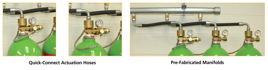 Compared with other high pressure inert gas systems, our series 400 valve regulates flow and pressure to allow the use of Schedule 40 piping for many applications. Installation time and labor costs are further reduced with the use of pre-fabricated manifolds, quick-connect actuation hoses and electrical connectors.